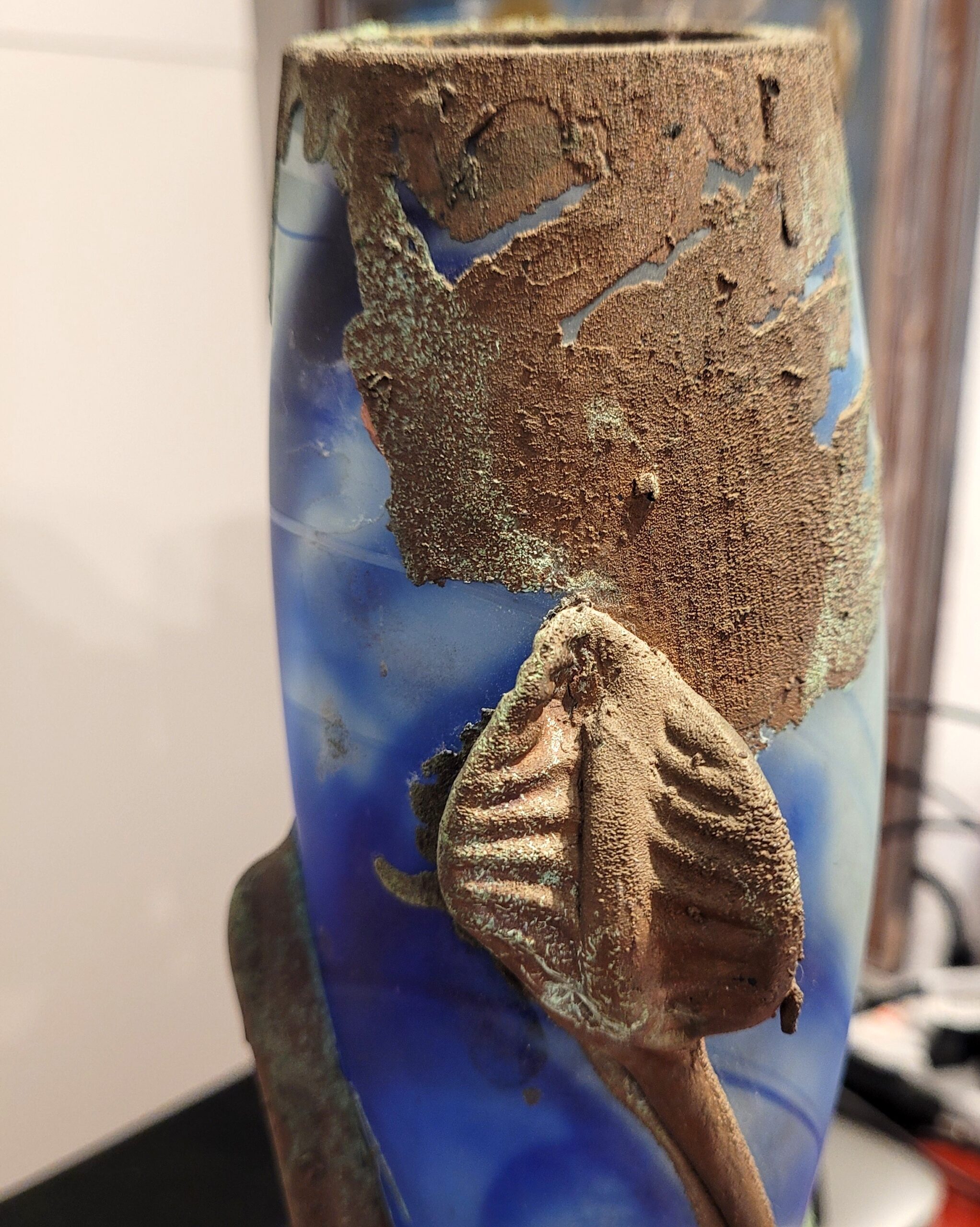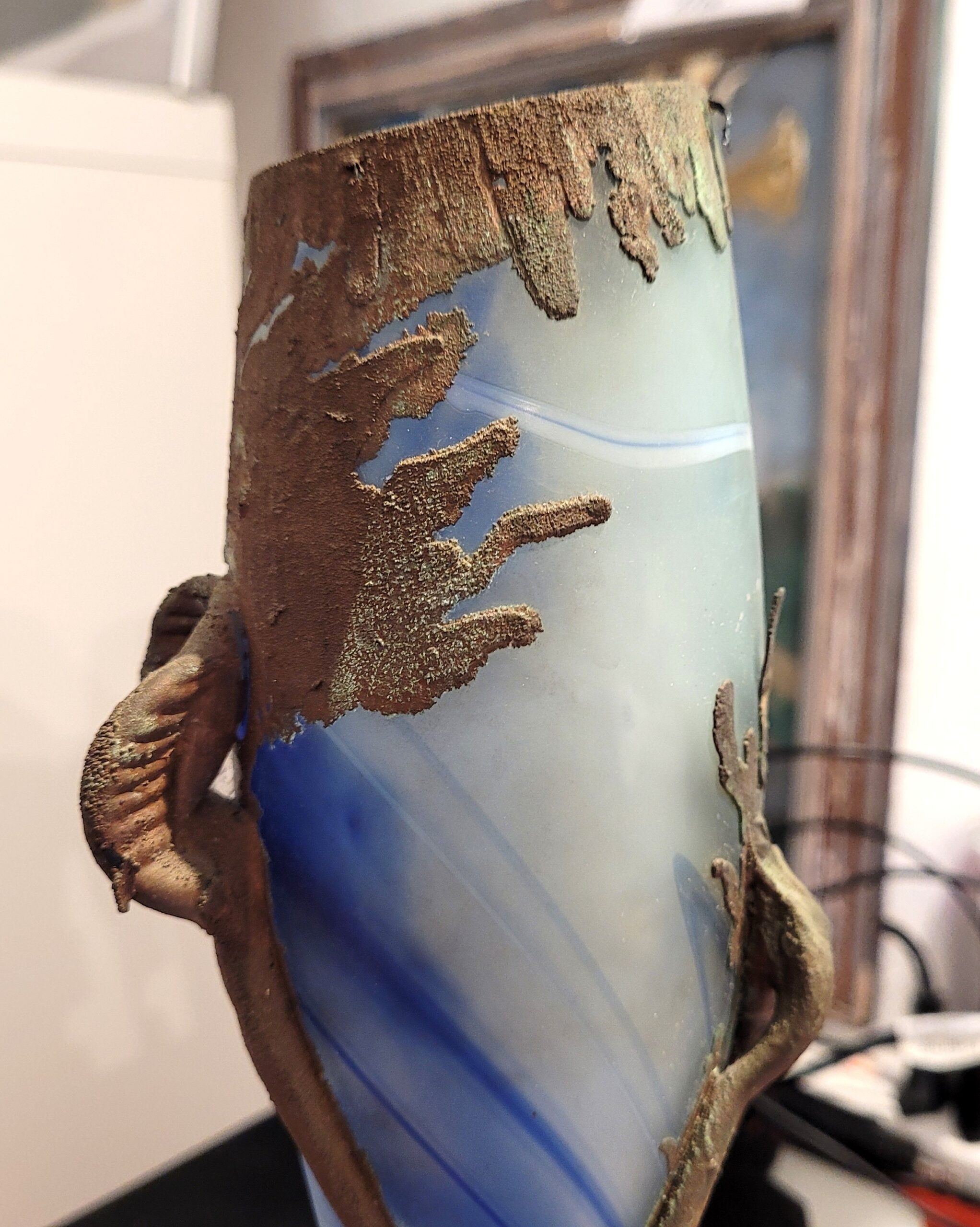 Antike Glas-Vase mit Metallverzierungen goldfarbig. Produktionsjahr 1920.